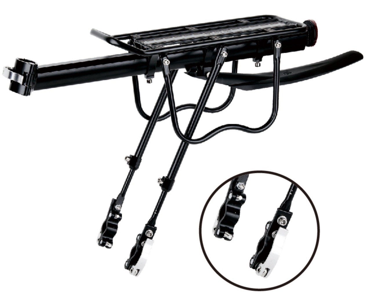 Багажник Stels BLF-H27-5 - универсальная модель, подходящая для установки как на городские, прогулочные, туринговые или гравийные велосипеды, так и на горные хардтейлы, с колесами от 24" до 28". Багажник устанавливается на перья рамы и подседельный штырь, притягиваясь прочными хомутами, с антискользящими резиновыми вставками. Направляющие дуги позволят выставить горизонтальное положение на любой геометрии байка. Нижние хомуты притягиваются к перьям эксцентриками, верхний фиксатор также выполнен на удобном эксцентрике. Благодаря своей разборной конструкции, багажник можно установить как с 3 точками фиксации, так и за 1 точку (консольная конструкция с фиксацией только за подседельный штырь). Основная платформа может регулироваться по удаленности от седла для четкого распределения баланса. Боковые дуги багажника также можно устанавливать и снимать в зависимости от специфики груза или сумки. Комплектуется дополнительно крылом защищающим от брызг и пыли. Располагает к предельной нагрузке до 9 кг. Фиксаторы, платформа и дуги выполнены из алюминия. Для пассивной безопасности укомплектован задним светоотражателем.